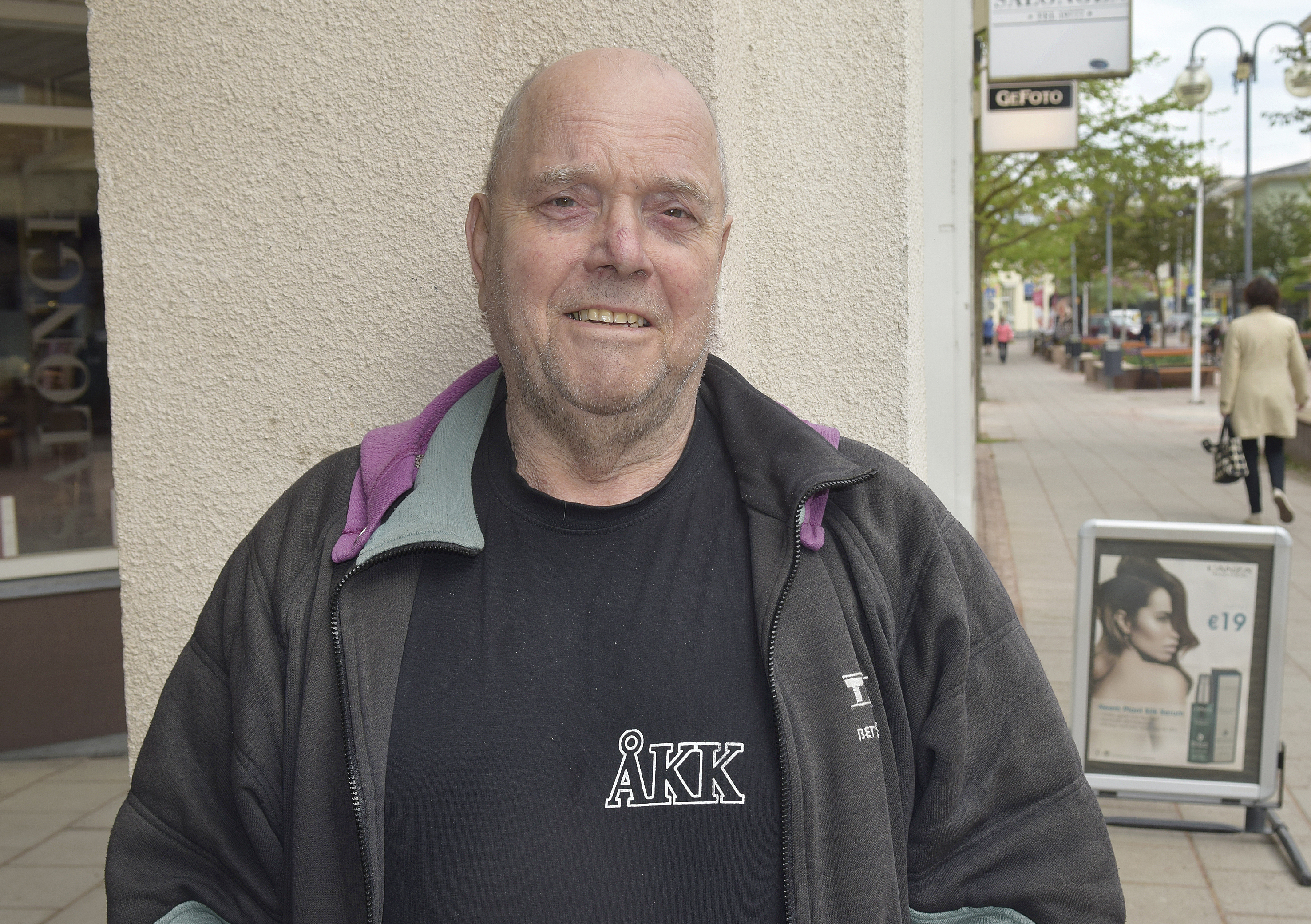 På stan är det folktomt, det är blåsigt och nästan lite kyligt ute. Vid Café Julius uteservering hittar vi Klas Helén som står med...