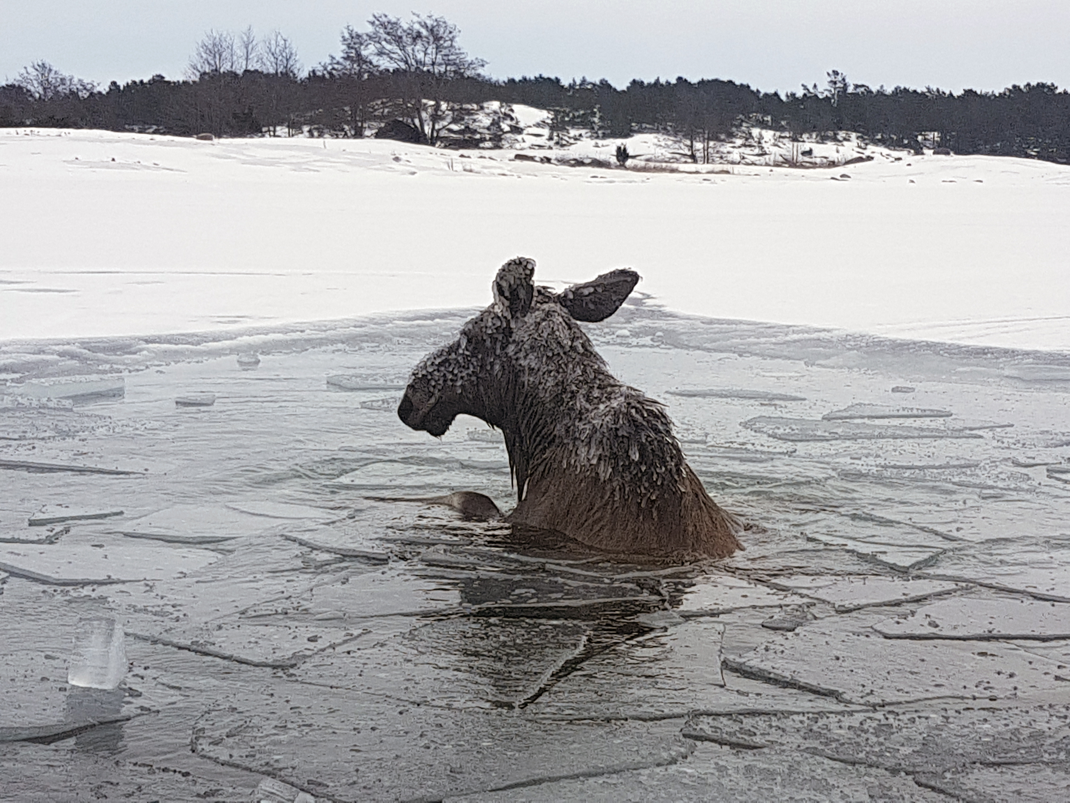 Älgko genom isen i Lemböte