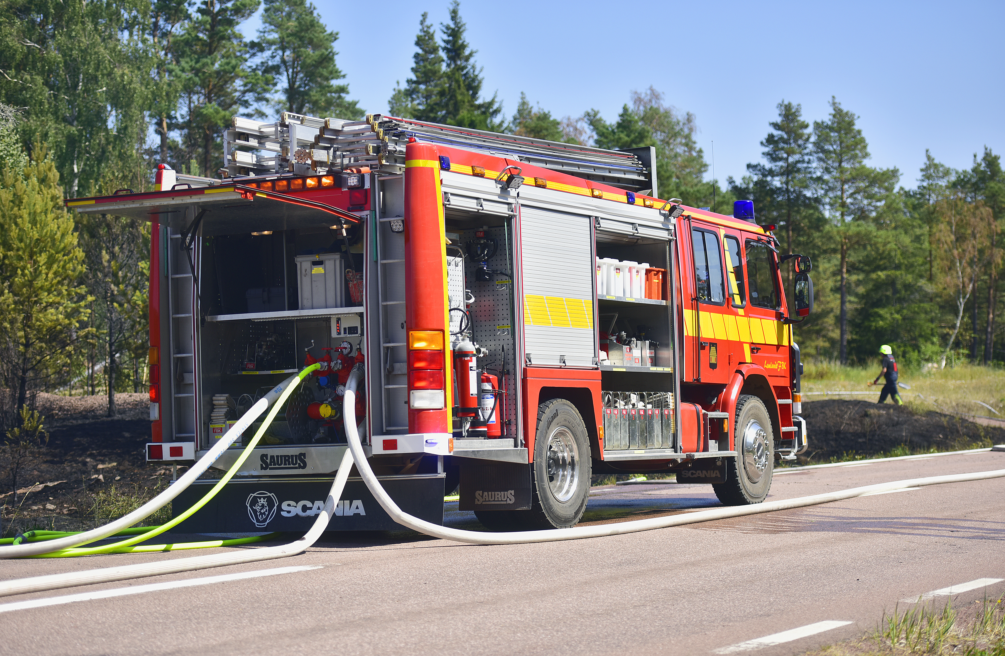 Bilar från såväl frivilligbrandkårerna i Lemland och Strandnäs som från räddningsverket...