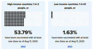 Höginkomstländer: 53,79 procent. Låginkomstländer: 1,63 procent. Så ser de aktuella siffrorna ut för andelen invånare som fått minst en dos vaccin mot covid-19. Statistiken...