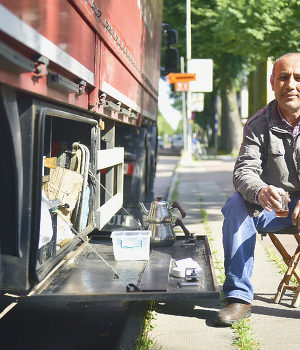 Vid Storagatan mitt emot ryska konsulatet har lastbilschauffören Adem tagit en paus.