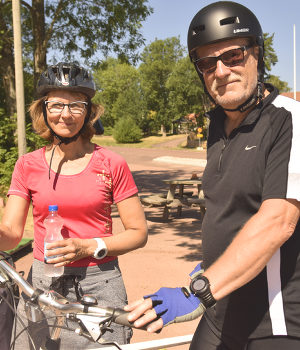 Dagens turister vandrar på Kasteholms yttre gård, på väg mot sina motorcyklar. De heter Tuomo Keiramo och Sanna Sjöberg.