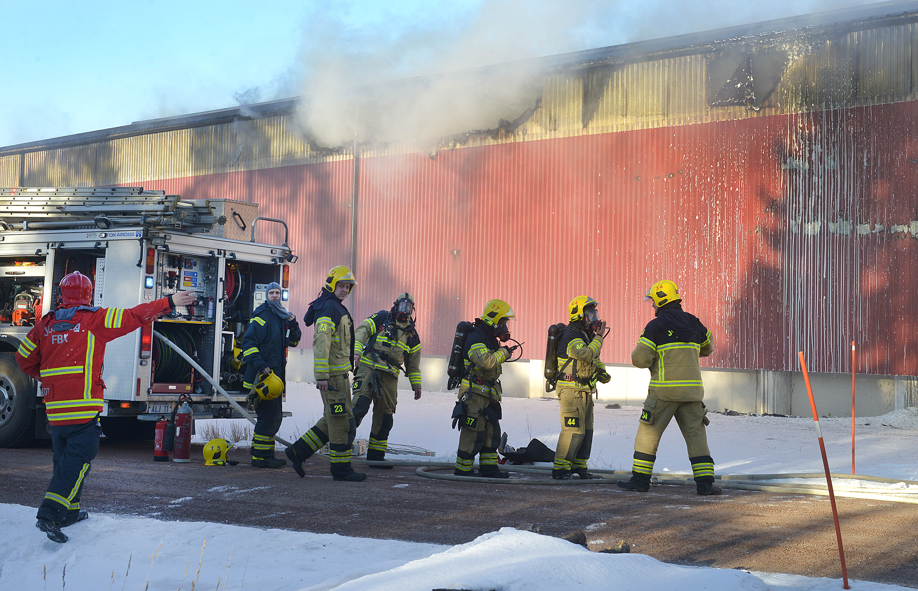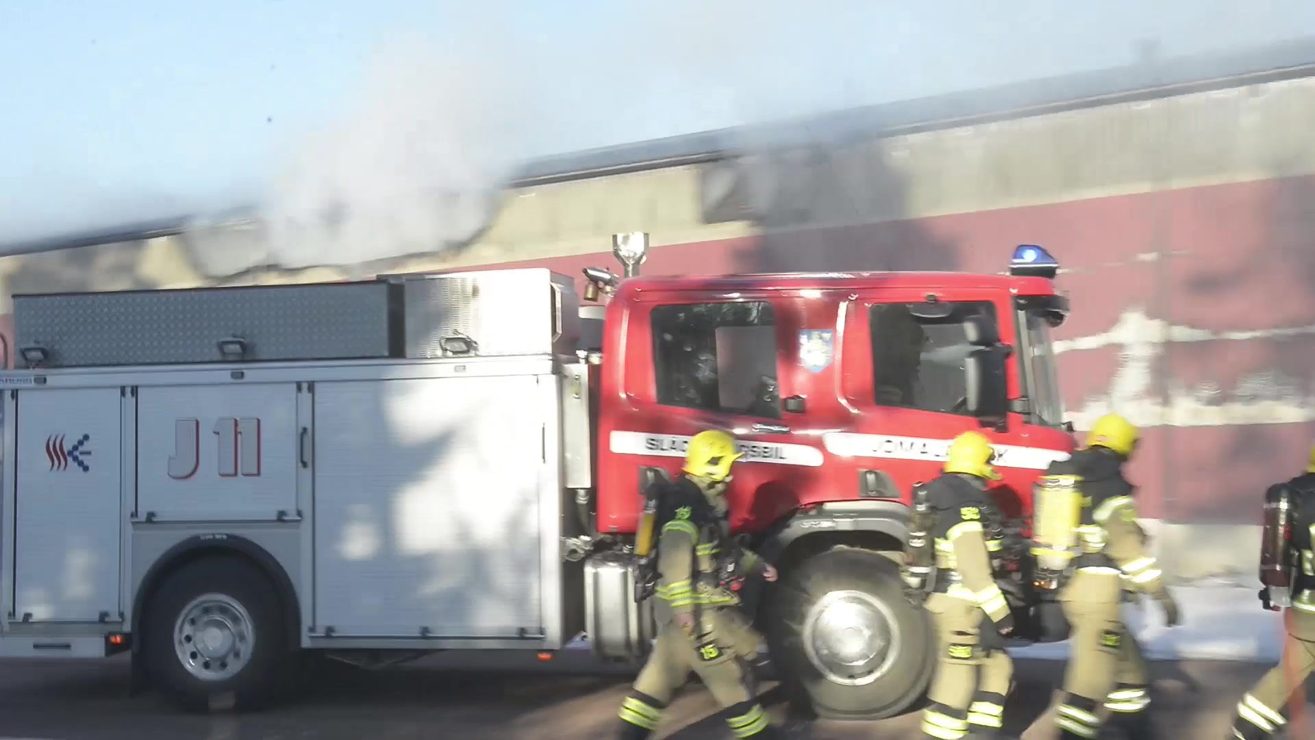 En brand pågår inne i lagerbyggnaden, som ser ut att ha fått omfattande skador. Bland annat är...