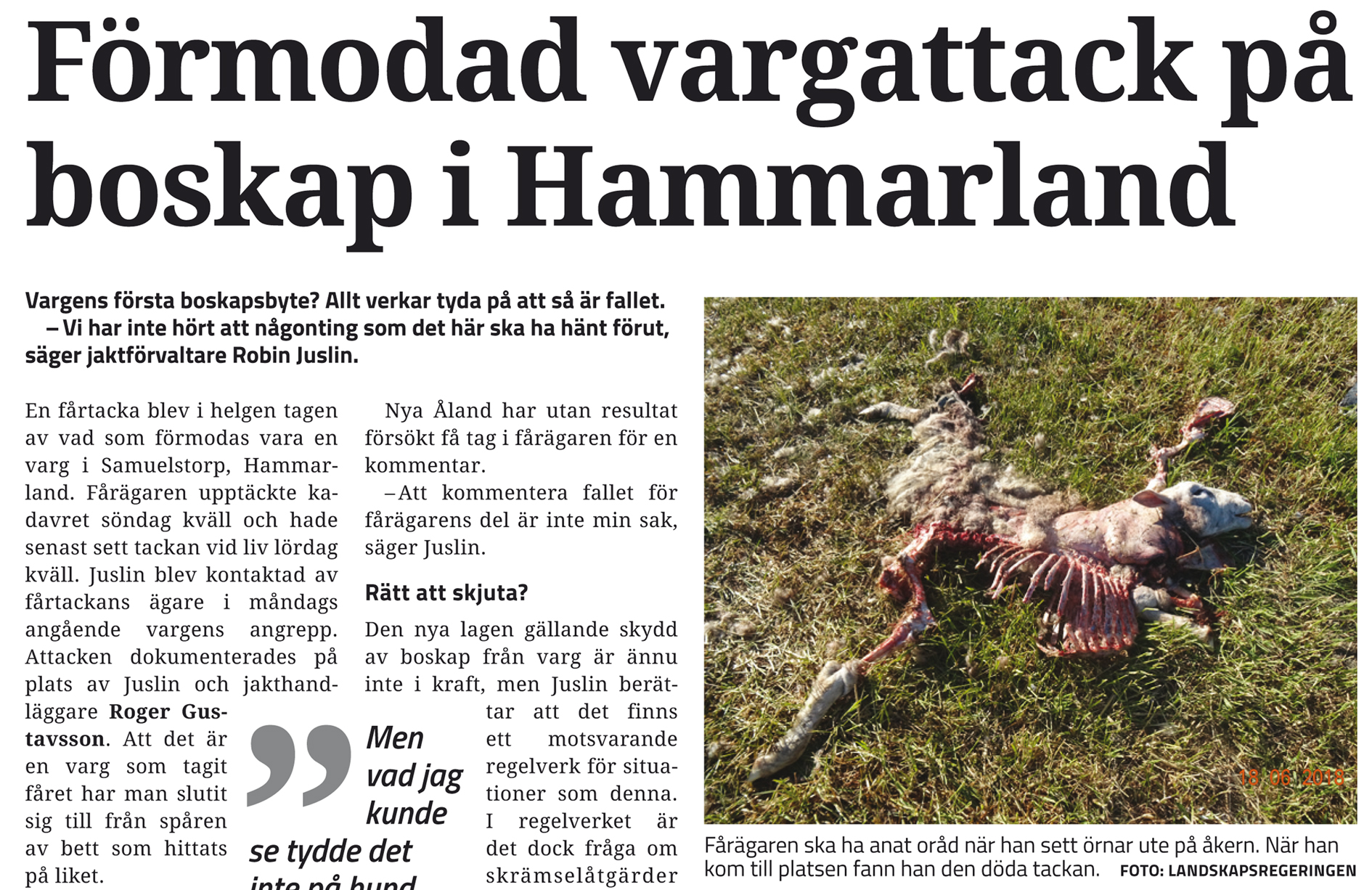 Efter attacken på fårtackan i Hammarland har inga nya anfall rapporterats. Man har dock sett vargen stryka omkring runt Samuelstorp, fångad på viltkamera.