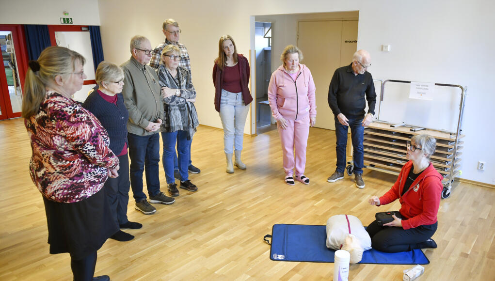Kursledaren Linda Nummelin-Gammals från Röda Korset demonstrerar hjärt- och lungräddning både med och utan defibrillator. Hon förklarar att en defibrillator kan inge falsk trygghet eftersom tillgången till en sådan inte alls betyder att man inte behöver kunna HLR. ”Det är för att det behöver finnas någon form av elektriska impulser i hjärtat för en defibrillator att jobba med”. Deltagarna Anki Johansson, Sonja Simolin, Kenneth Mattsson, Carita Josefsson, Leif Englund, Maiken Poulsen-Englund, Susann Blomqvist och Sture Toivonen lyssnar.