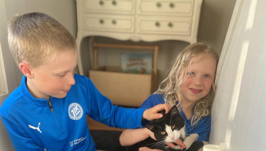 Foto: PrivatI maj fastnade katten Pandis i en tall och fick brandkårshjälp att ta sig ned. Syskonen Ivar och Ingrid Blomberg var lyckliga när Pandis äntligen kom hem efter ett dygn på tio meters höjd.