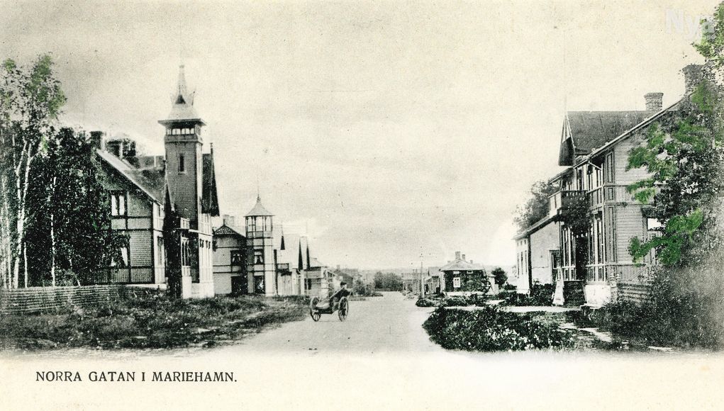 Vy från Norragatan i Mariehamn, Kjell Ekströms samling. Så här berättades om vyn när en kolorerad variant av kortet publicerades i Nya Ålands serie Vyer från förr den 24 december 2015: Till vänster Privata sjukhuset, ritat av Lars Sonck. Den 21 februari 1935 utsattes lantrådet Carl Björkman för ett skjutattentat i sitt hem (följande hus på vänster sida) och flydde över gatan till sjukhuset. Skottet hade träffat i magen, men inget sår syntes. Sedan upptäcktes att en näve mynt som han haft i västfickan hade stoppat kulan.