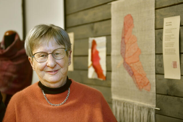 Hanna Wiik-Rosenqvist utbildade sig i vävning under flera år men tröttnade på hantverket på kuppen. För några år sedan kändes det roligt att börja igen och nu har hon hittat glädjen i att väva. Hennes grej är att utgå från lokalproducerat garn eller använda det som redan finns. Sjalen till vänster om henne är av garn hon färgade under 90-talet.
