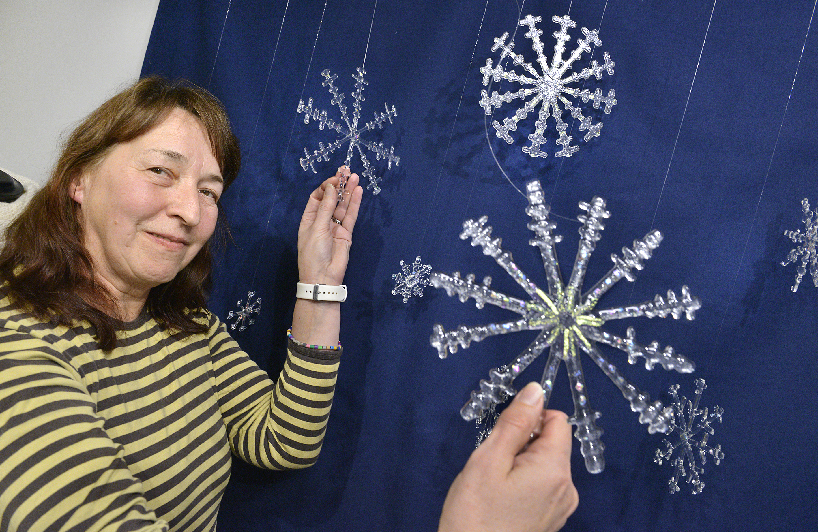 Därinne har 13 medlemmar sin årliga julutställning med finurliga och praktiska saker och ting med presenttycke. Ritva Saloranta visar stolt upp sina delikata glasstjärnor medan Wiik-Rosenqvist å sin sida är representerad av mobiler av plastsugrör och upphittade glaskristaller.