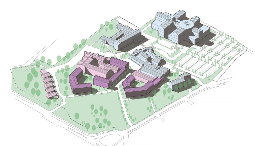 De första byggnaderna på det nuvarande sjukhusområdet byggdes i början av 1950-talet och med tiden har det byggts ut och nytt runtomkring.