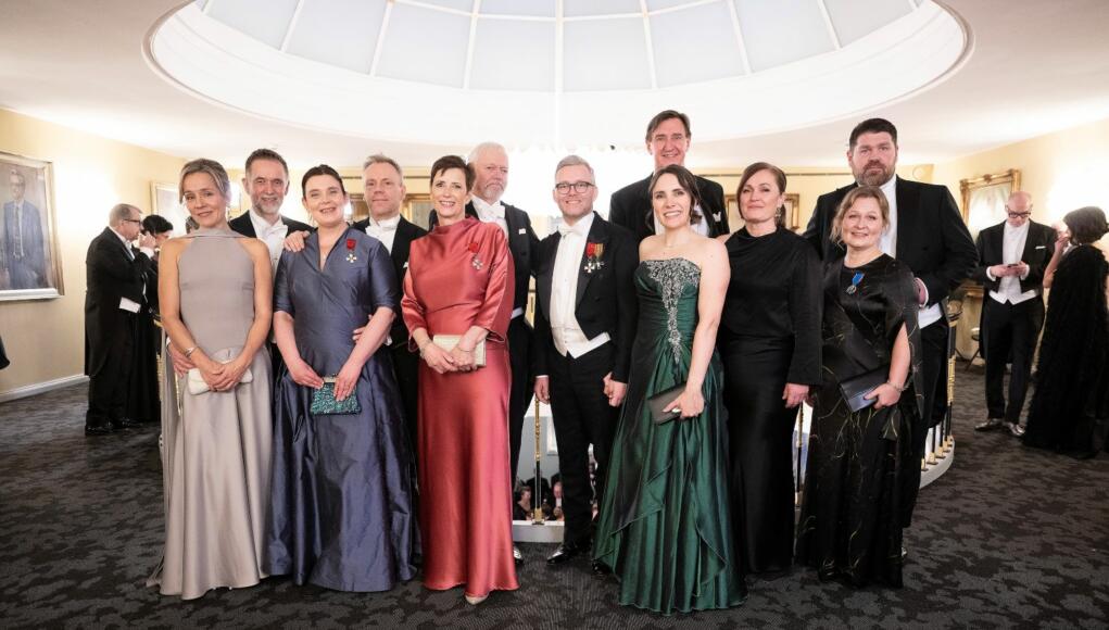 Högskolans t.f rektor Mattias Waller med makan och politikern Aino Waller, förvaltningschefen vid statens ämbetsverk Sören Silverström och tingsdomare vid Ålands tingsrätt, Irina Wikström, landshövding Marine Holm-Johansson med make Bengt Johansson, riksdagsledamot Mats Löfström och Visit Åland vd:n Noora Löfström, talmannen Jörgen Pettersson och makan frun Helena Wachowiak samt guldsmeden Maria Karlström och maken Fredrik Lundberg. Det var Karlström som i år fått äran att designa presidentfruns smycken.