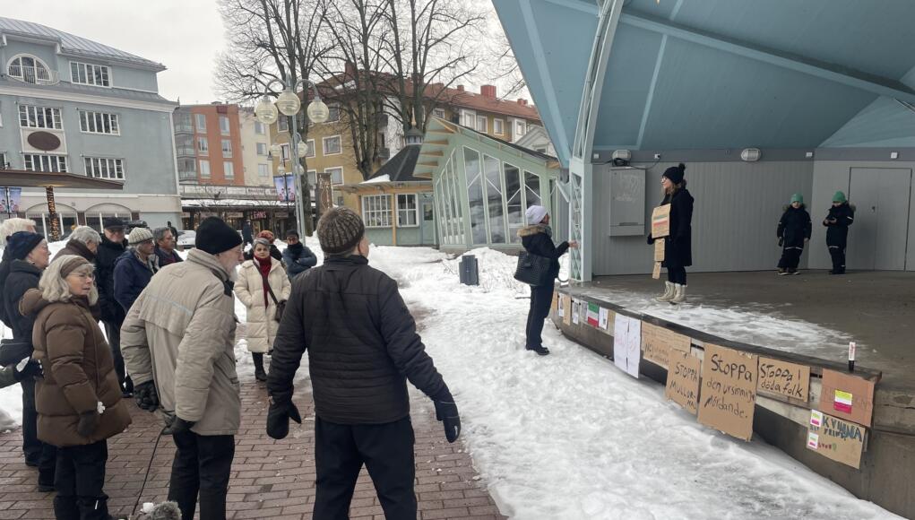 Foto: William SteniusEtt 20-tal personer samlades vid torgscenen på lördagen för att ge stöd till protestanterna i Iran. Protesterna i Iran uppmärksammades i Mariehamn Nyheter 17:00 söndag, 18 januari, 2026 DELA Facebook Mer läsning Ahmad Shafiei om regimens svar på protesterna i Iran: ”Det är ett helvete” Demonstranter för Gaza: ”Tystnad dräper” Iransk domstol dömde Vera-filmmakare till fängelse