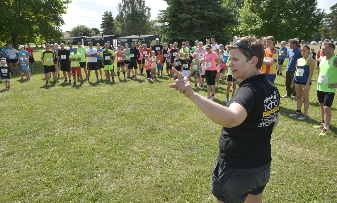 Vid starten och mållinjen sitter Claes Hellström och Jani Westerlund och sköter bland annat tidtagning. Evenemangsledare Ia Colerus berättar hur loppet ska gå till innan start.