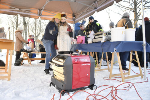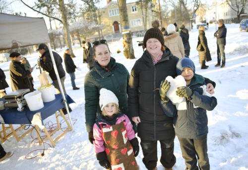 Just då stannar en bil till och Rotarys Pia Widén får hjälp med att lasta ur en generator. Våffelmaskinen kopplas i fem i 17 och sprider goddoftande rök över sällskapet när själva demonstrationen och dagens tal hålls.