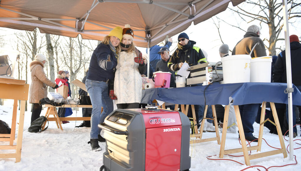 Just då stannar en bil till och Rotarys Pia Widén får hjälp med att lasta ur en generator. Våffelmaskinen kopplas i fem i 17 och sprider goddoftande rök över sällskapet när själva demonstrationen och dagens tal hålls.