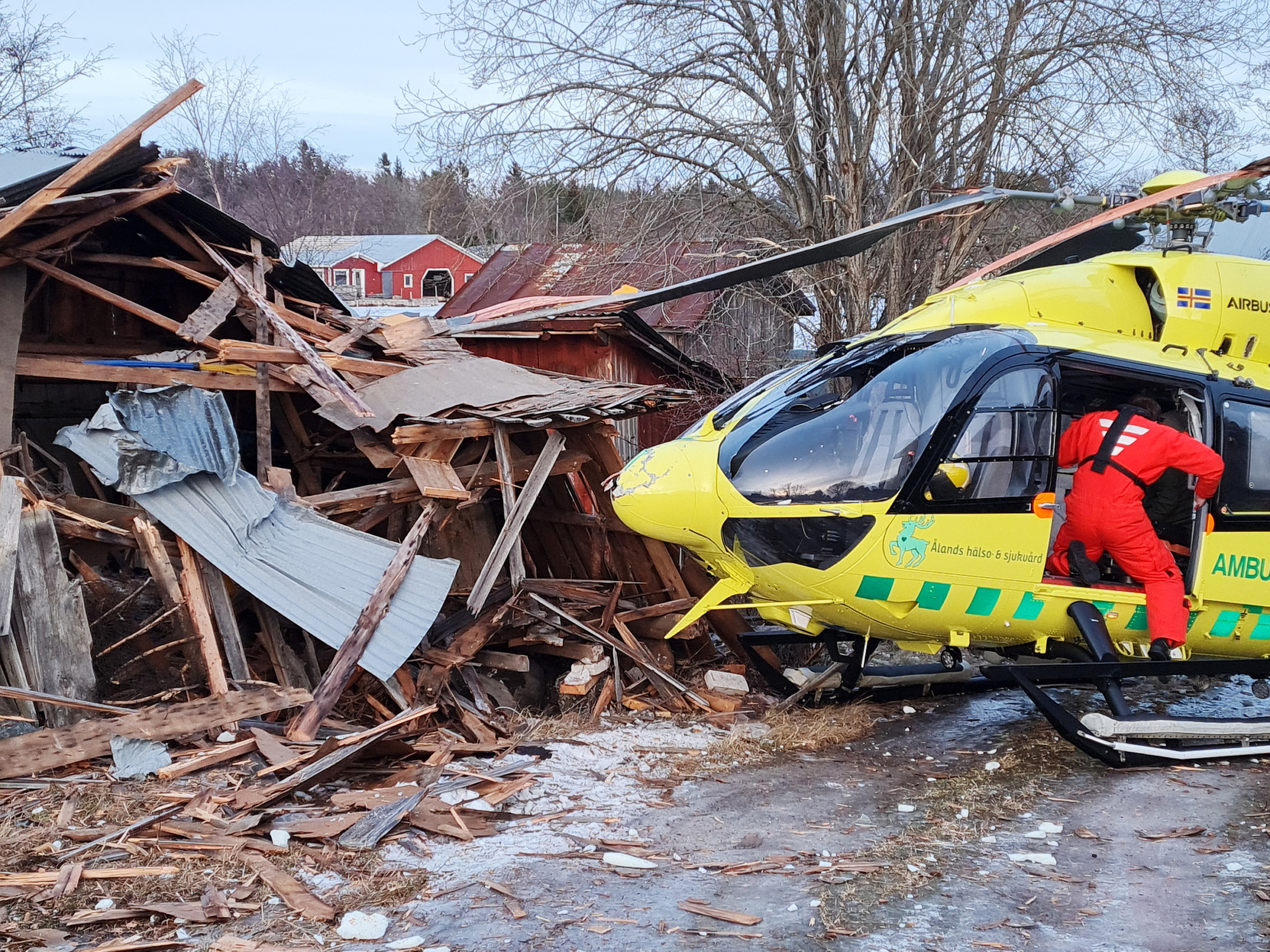 En ambulanshelikopter som landade på Fiskö i Brändö på lördag eftermiddag kanade i väg på det hala underlaget och kraschade in i ett strandskjul....