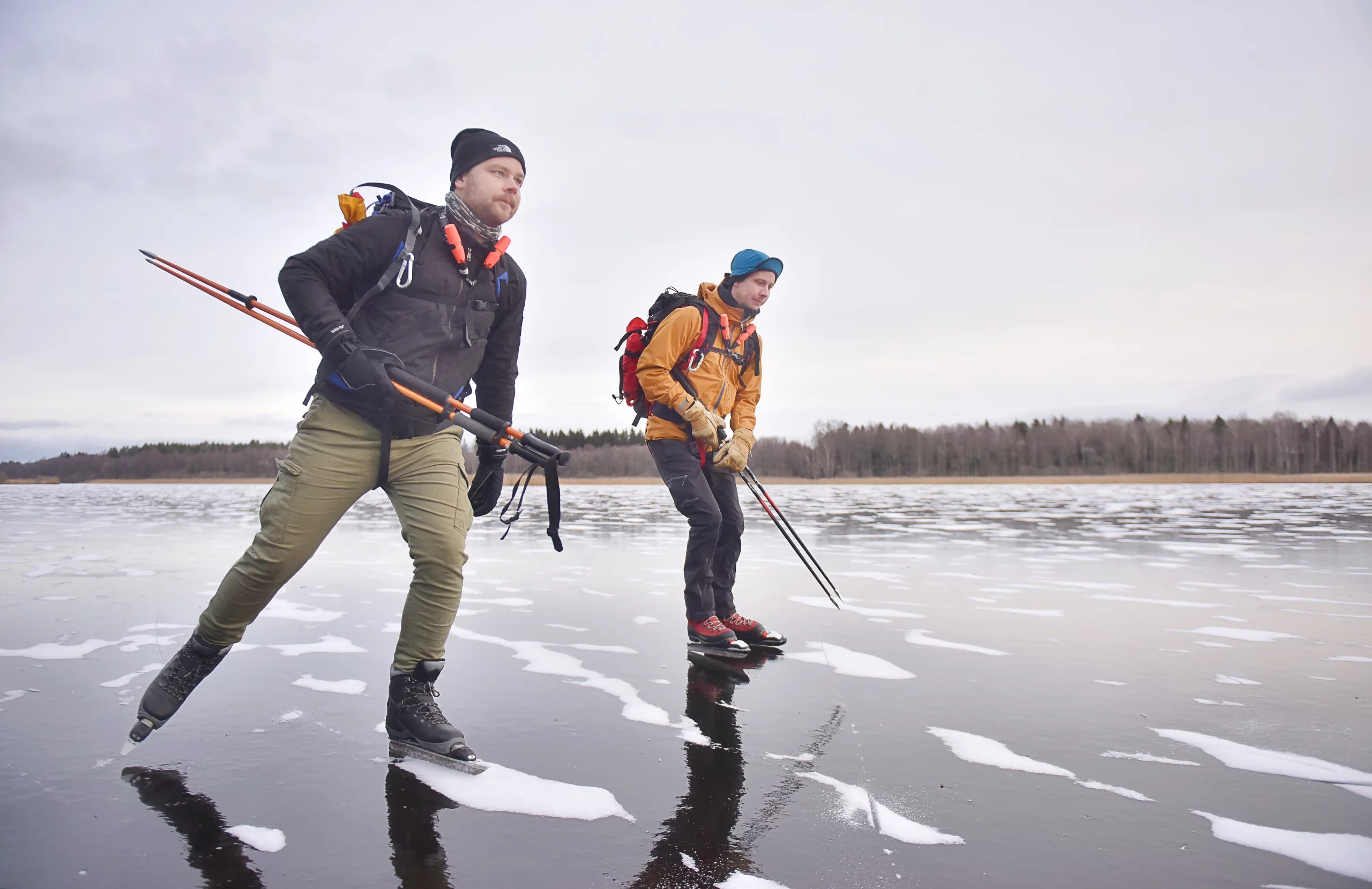 Isen på Bjärströms träsk i Finström ligger blank och slät på fredagsmorgonen: perfekta förutsättningar för den som är ny på det här med långfärdsskridskor.