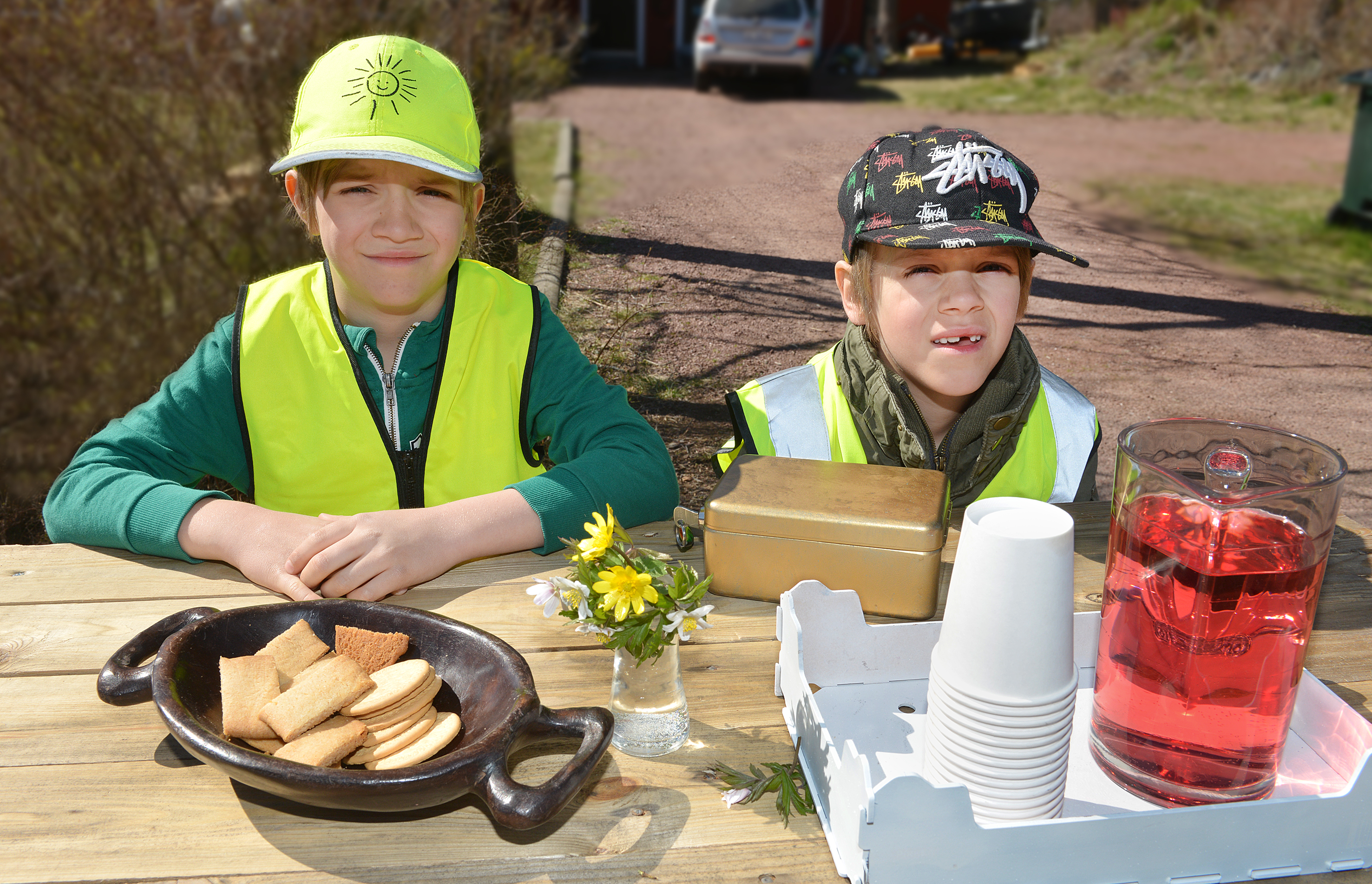 Är det någon som är sugen på saft och kakor? Efter skolan håller Oliver Sandberg, 8, och Rasmus Sandberg, 7, sin nya saftkiosk öppen...