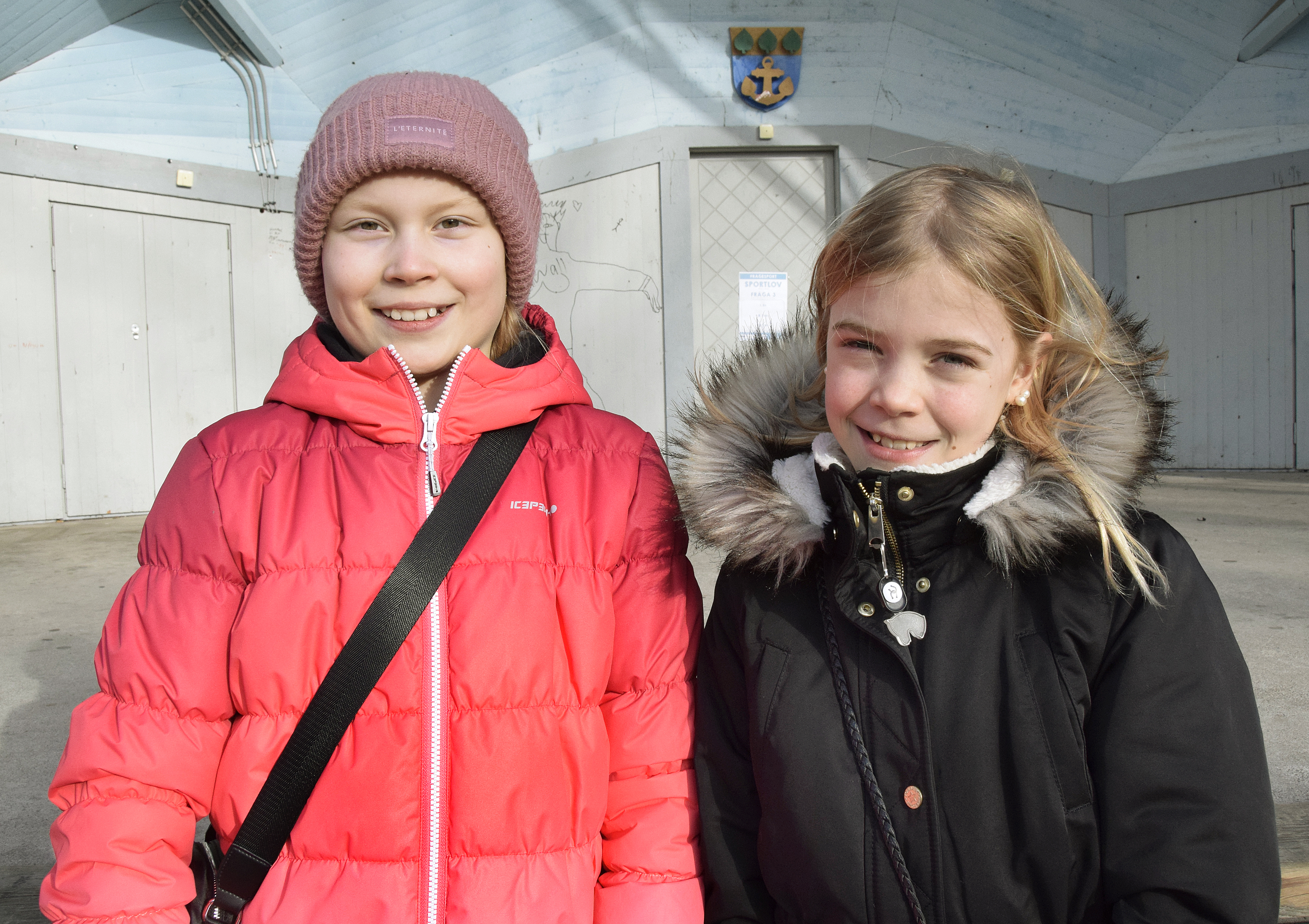 Lovi Silvander och Siri Westman går med raska steg över Torget. De är med i en sportlovsfrågesport.