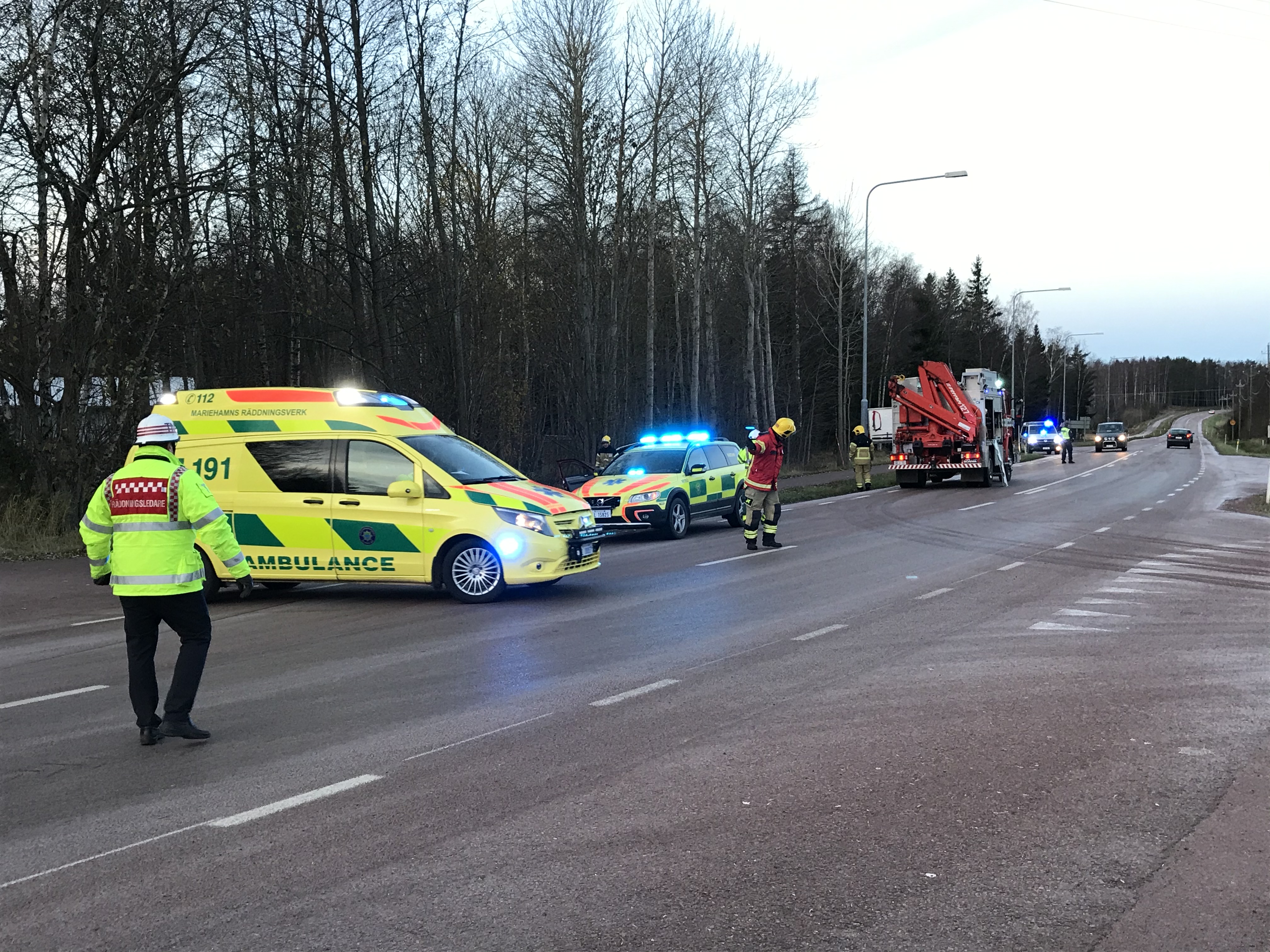 En kvinna fick sladd i korsningen till Önningeby och gick av vägen. Vid avkörningen välte bilen och hon klämdes fast.
