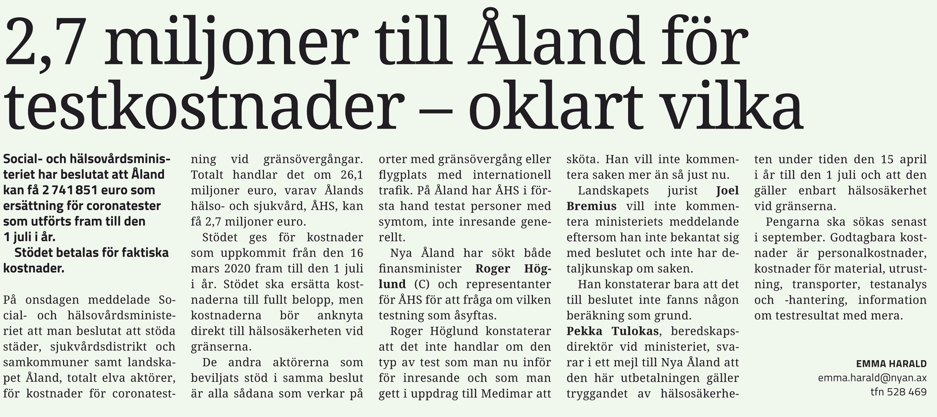 ÅHS ansökte om ersättning för testning i anslutning till gränsövergångar för säkerhets skull för våren och inledningen av sommaren, eftersom man inte visste om...