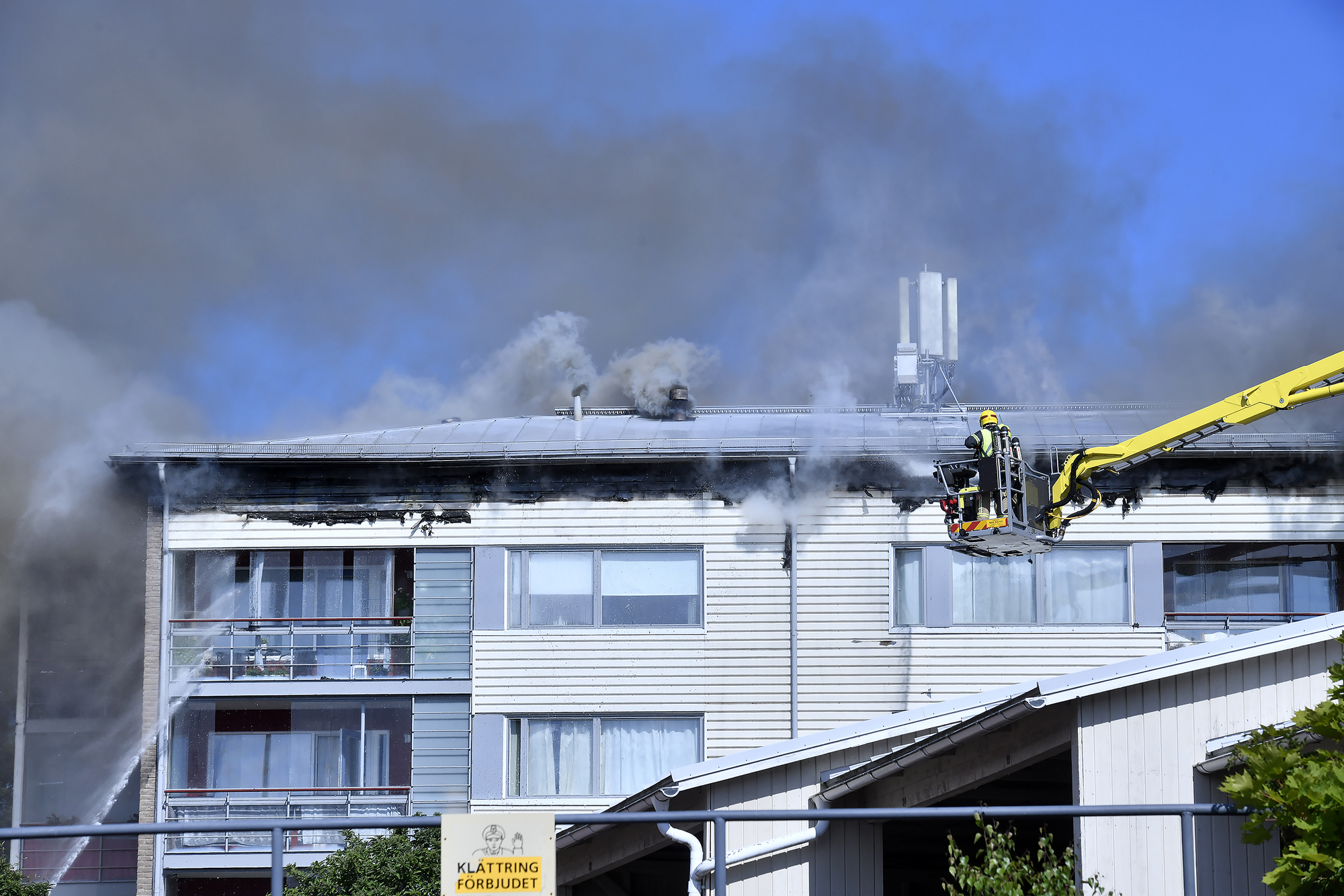 Vid 18.40 på torsdagskvällen observerades rökutveckling från taket på lägenhetshuset på Doppingvägen. När räddningstjänsten kom till platsen konstaterade de att brandrester uppe på taket...