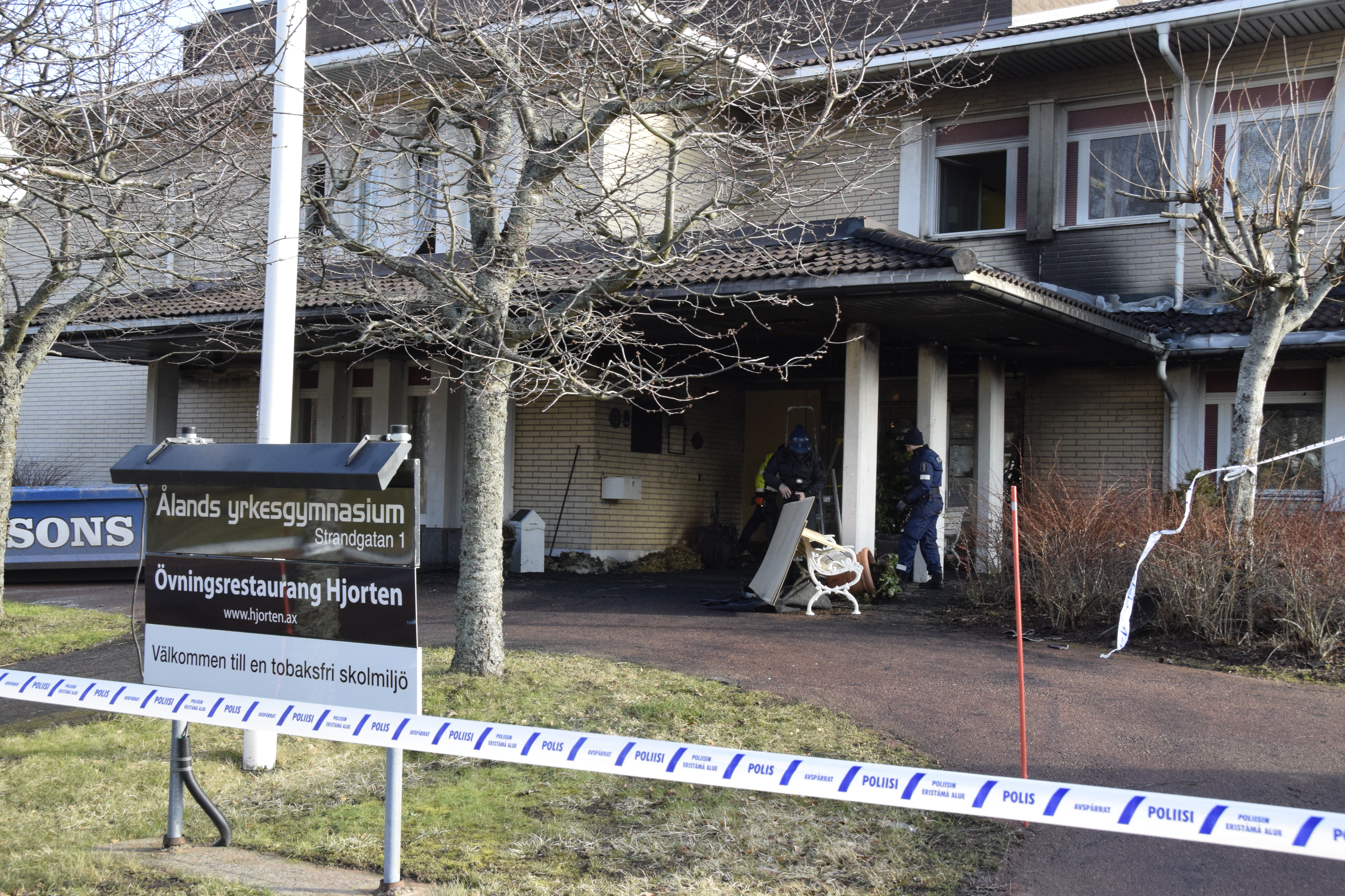 Hotell- och restaurangskolans entré brann i natt. Husets entré mot Strandgatan och en stor del av fasaden omkring entrén har fått omfattande skador. Inomhus...