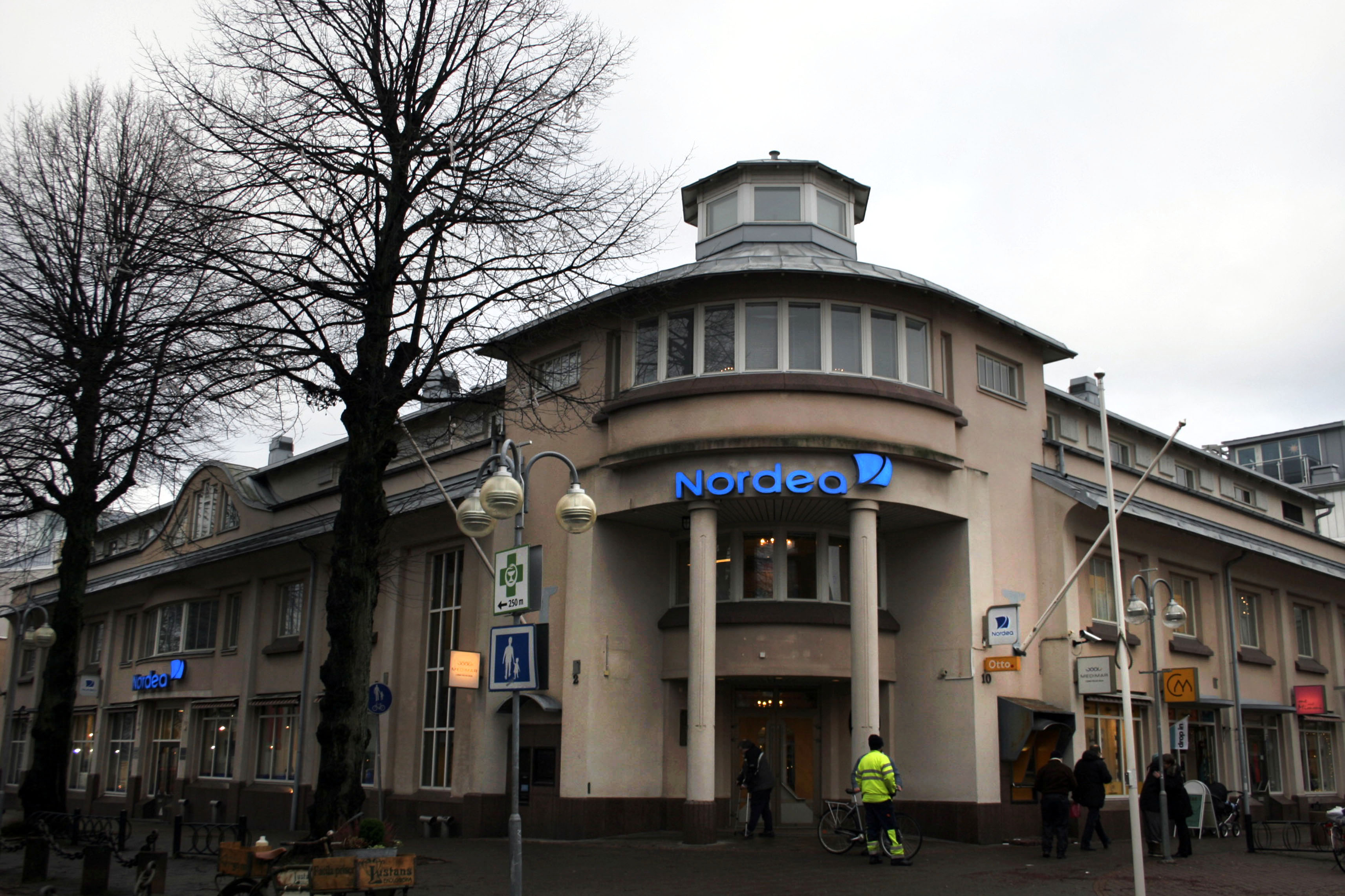 Landskapsregeringen avslår Alandiabolagens ansökan om jordförvärvstillstånd för flera fastigheter i stan, bland annat Nordeahuset i hörnet Torggatan-Norragatan.