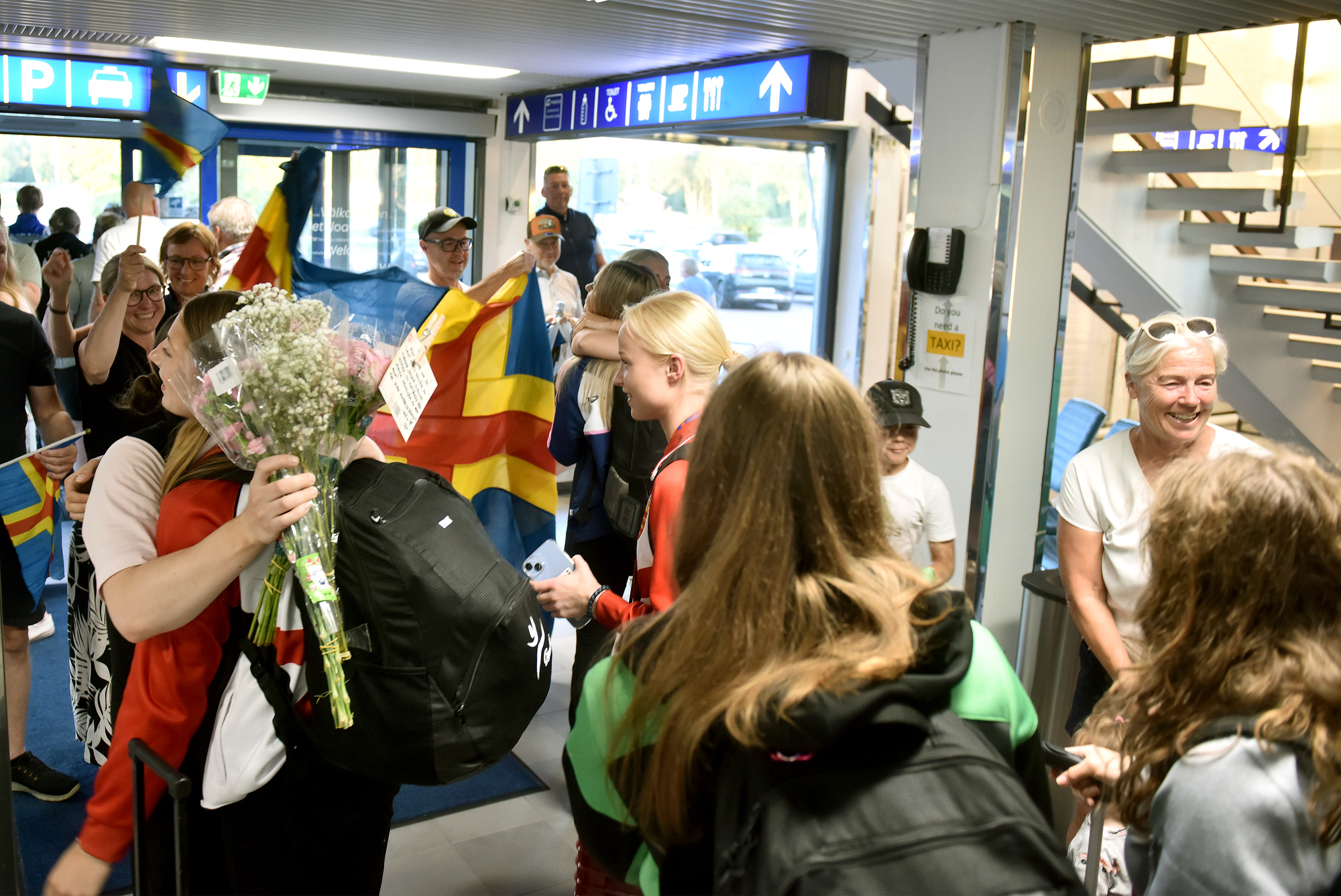 Många samlades vid Mariehamns flygplats för att ta emot de åländska idrottarna när deras flyg landade vid klockan 22 igår, lördagen den 19 juli.