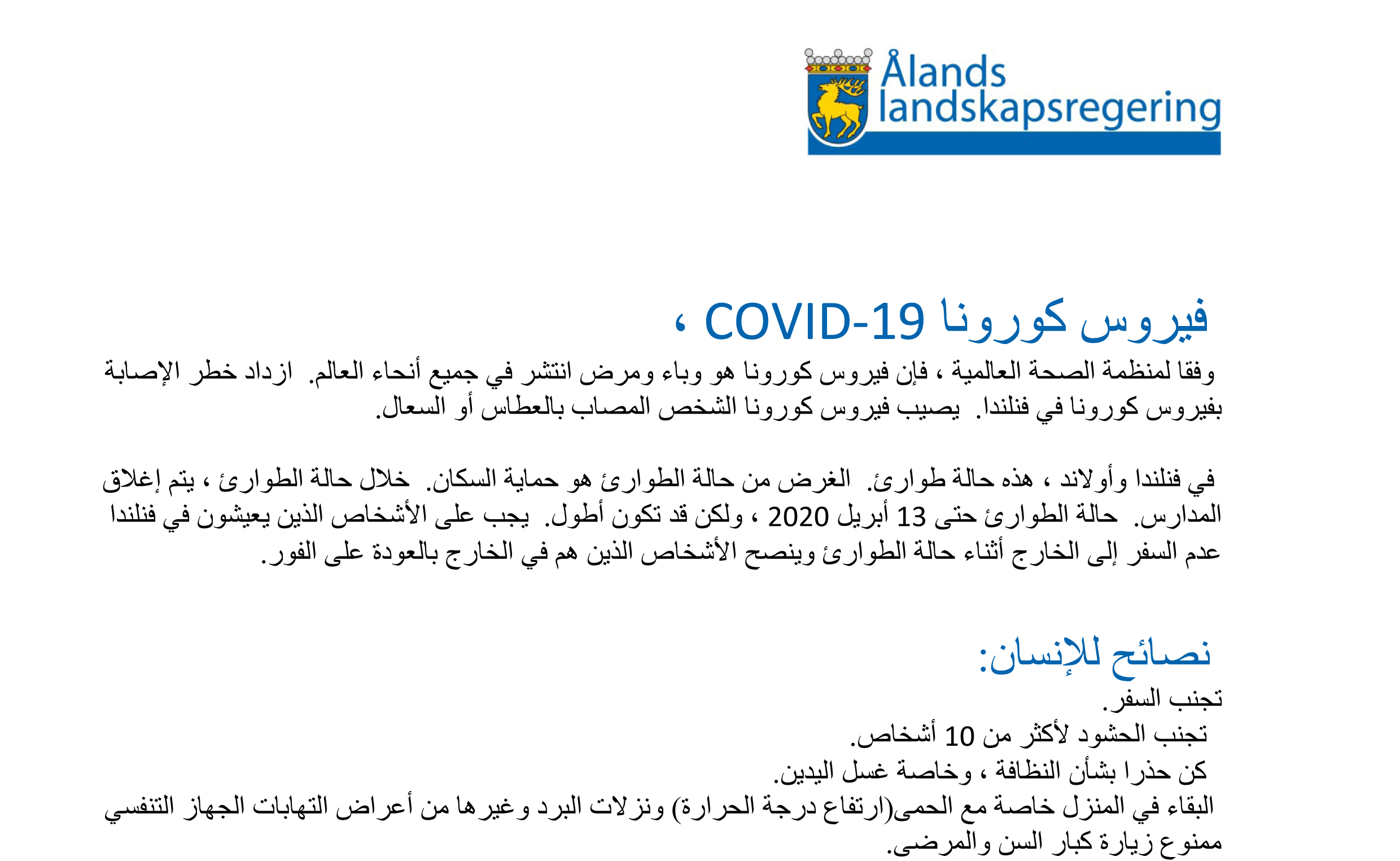 Ålands landskapsregering har sammanställt information om corona på olika språk. Bladet innehåller allmän information om coronaviruset och råd till allmänheten samt symptom och telefonnummer till...