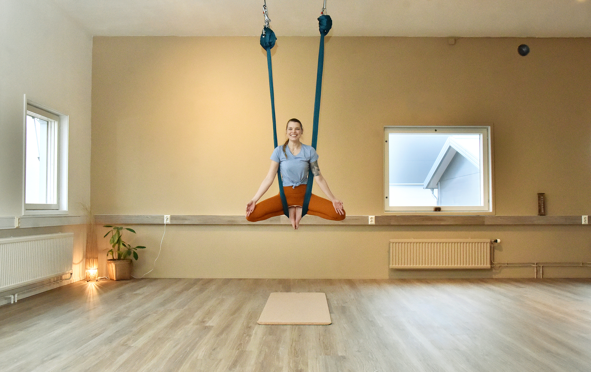 I ”Aerial yoga” hänger man från taket i tyghammockar.