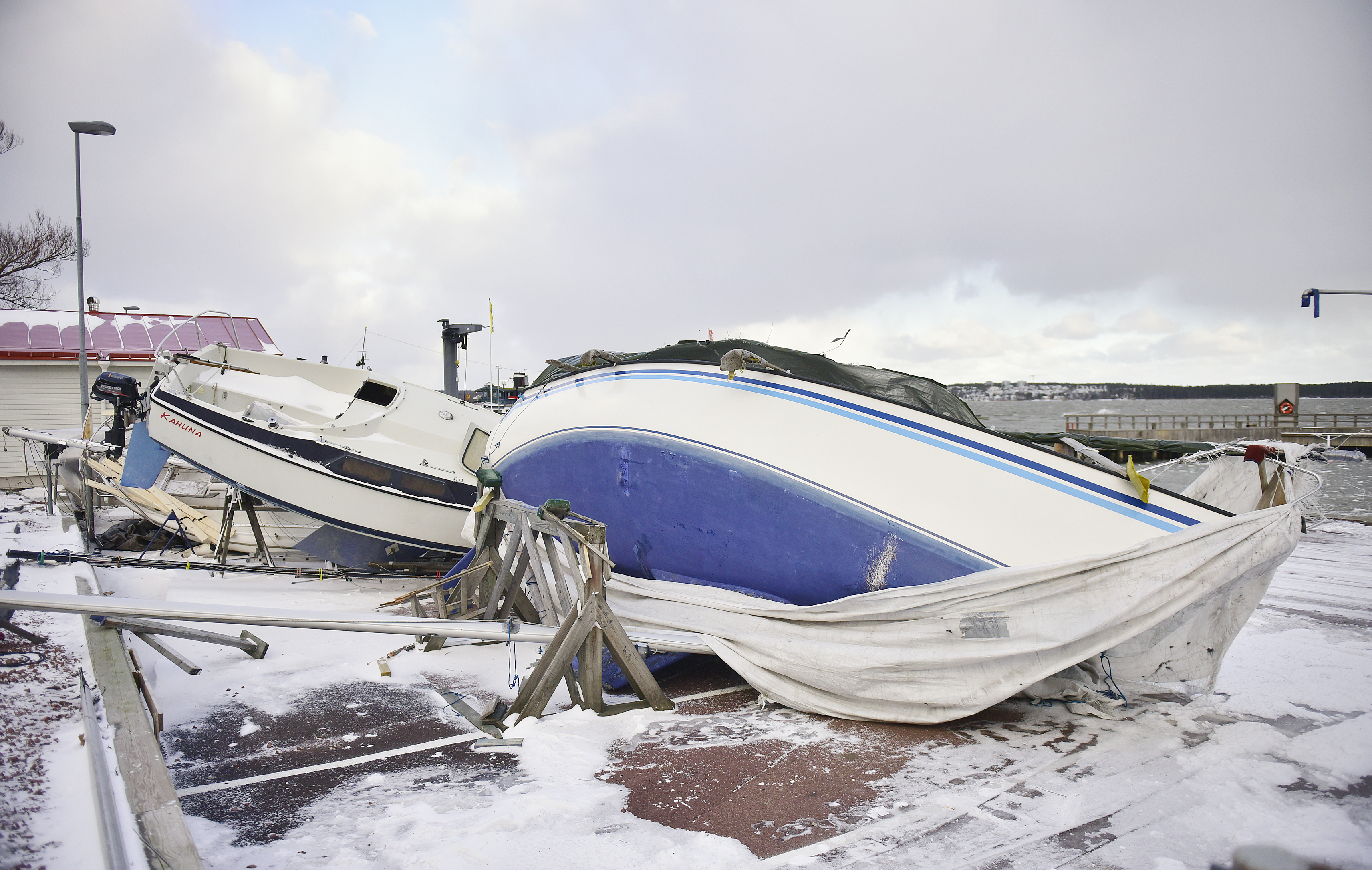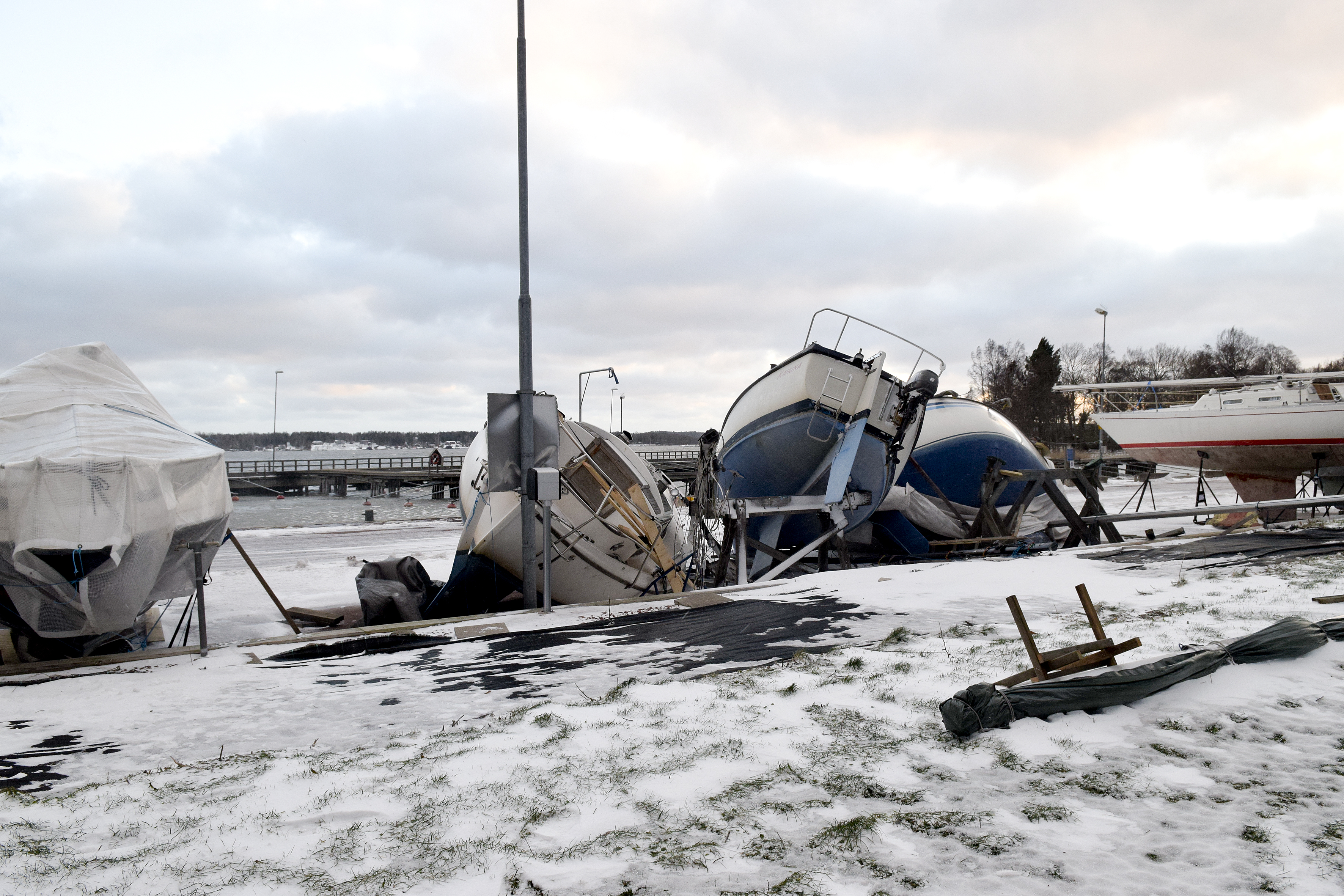 Nedfallna träd, trasiga elledningar, bilar i diket, omkullblåsta båtar. Oredan var stor när fotograf Jonas Edsvik åkte runt på Åland idag.