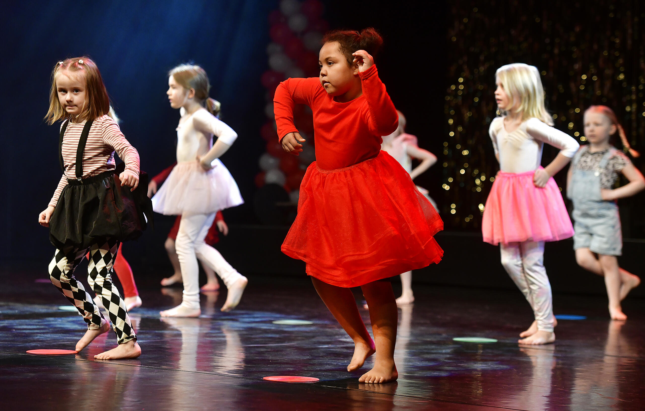 Dunderdans bjöd idag på dansshow med cirkustema. Det var fyra grupper DunderSMÅ för fem-och sexåringar, samt två grupper DunderLITEN för fyraåringar. Kostymerna matchade temat...
