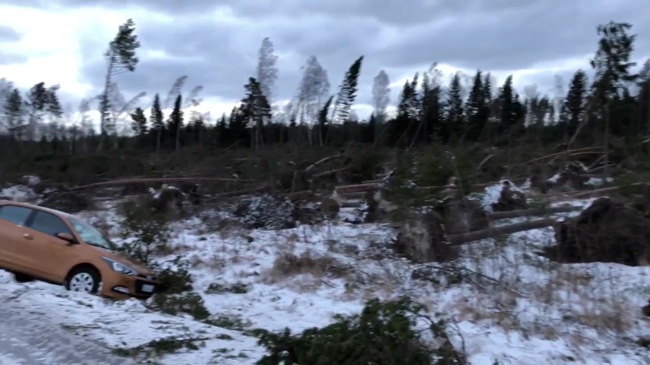 Stormen, som under natten uppgått i orkanbyar, har lamslagit Åland och orsakat stora skador. Ovan syns en video från Södersundavägen tagen av Jonas Edsvik.